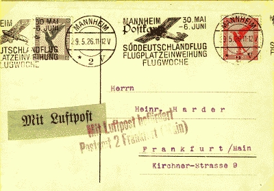 Durch die Deutsche Luft Hansa AG., Berlin, wurde am 8.4.1926 der Flugpostdienst auf der Strecke Berlin - Karlsruhe eröffnet.