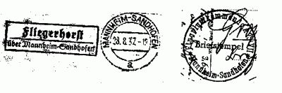 hieß dann „Mannheim-Sandhofen 1”. Stempel für diese Ämter wurden im Verein nicht gefunden. Am 22.März 1945 wurde der Fliegerhorst vom deutschen Militär gesprengt.