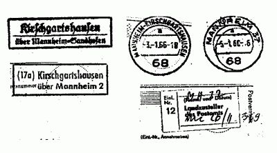 wurde die Poststelle II Kirschgartshausen/über Mannheim-Sandhofen aufgehoben, aber am 1. Mai 1954 bestand wieder eine Poststelle II, aber als Kirschgartshausen über Mannheim. Zum 1. Juli 1961 wird