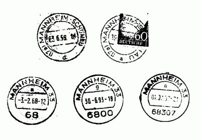 ein Stempel „Mannheim-Blumenau” im Gebrauch gewesen sein, wenn es sich nicht um eine Verwechslung mit dem abgebildeten Stempel mit der Mannheimer Postleitzahl „68” handelt. Den