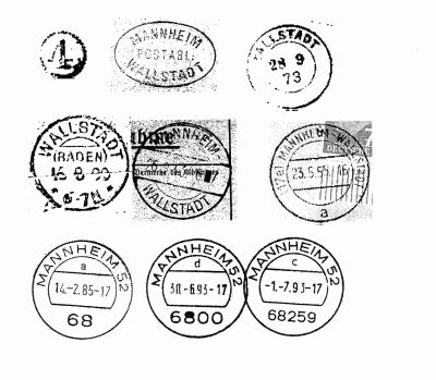 Eingemeindung 1929 wurde nur überliefert, daß 1928 die Postagentin Marie Reinmuth hieß.. Nach der Eingemeindung werden Zweiringstempel mit Ortsbezeichnung Mannheim - Wallstadt und ab